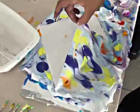 Traditionnellement, le papier marbré est réalisé en faisant flotter des pigments sur de l’eau ; cela demande une chimie particulière et ce n’est pas forcément le plus pratique, surtout avec des enfants surexcité·e·s.