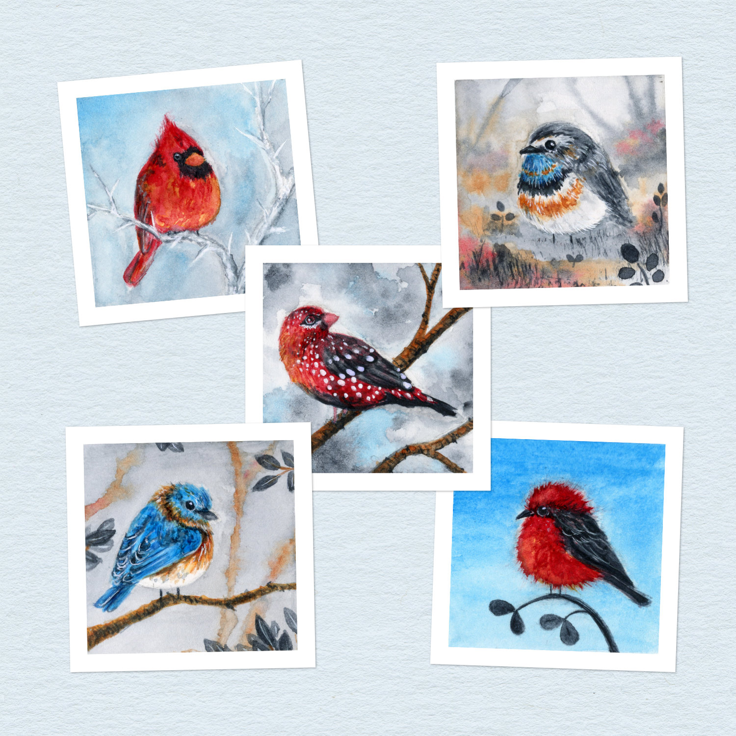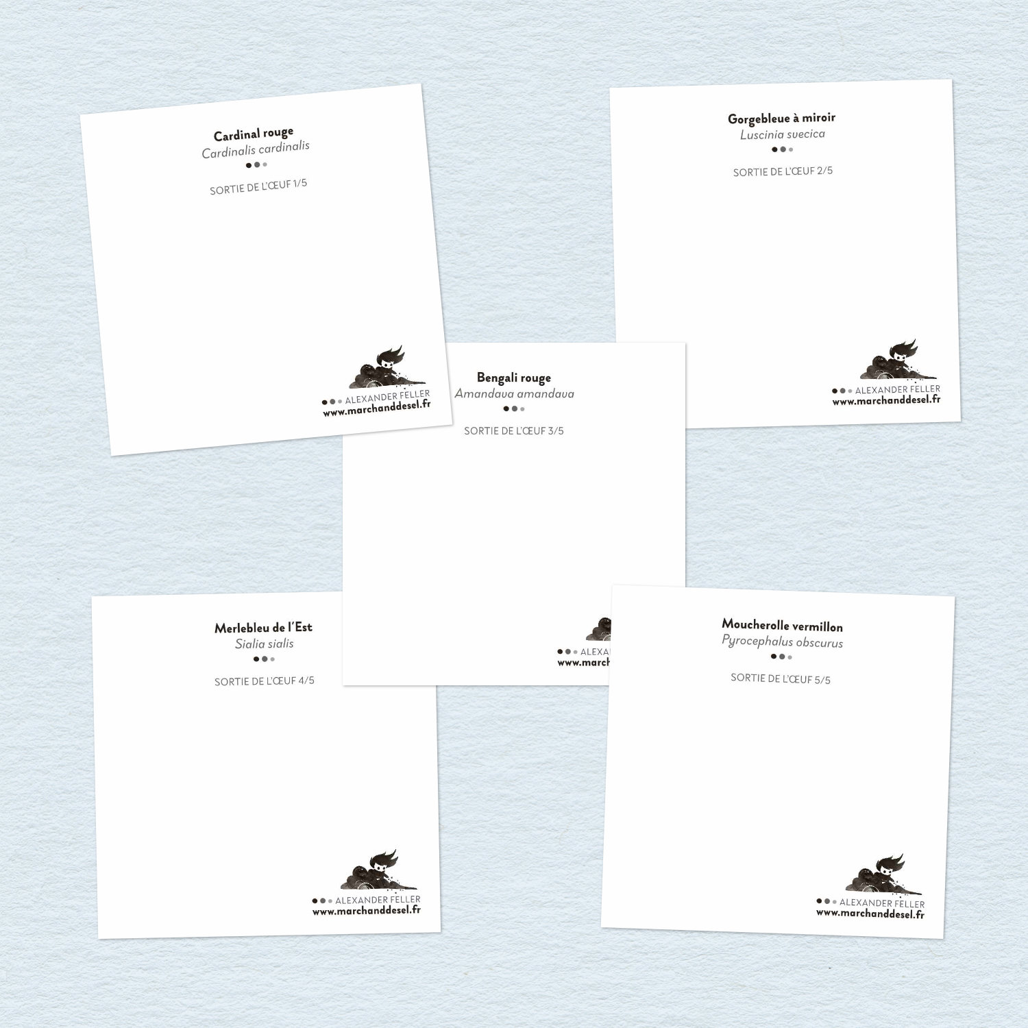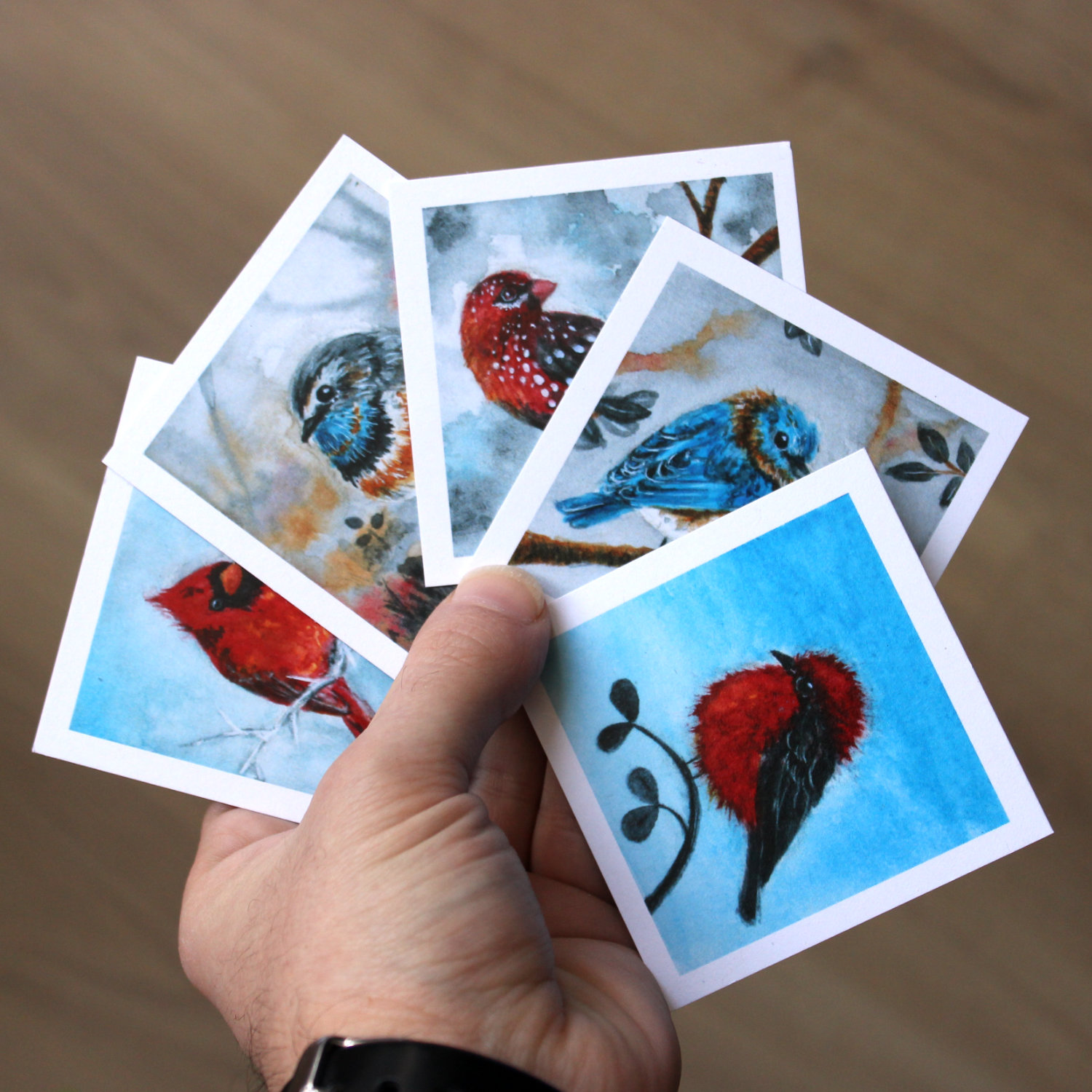 Collection de cinq petites cartes d’oiseaux dans les tons bleus, roux, rouges.